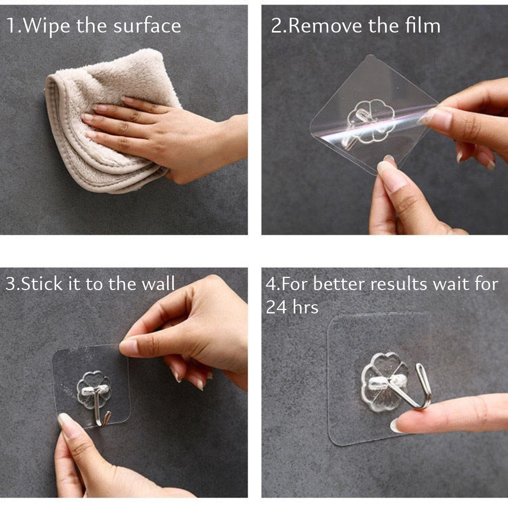 - 🧱 No Drilling, No Damage Enjoy damage-free hanging! These wall hooks stick securely on smooth surfaces like tile, wood, glass, and stainless steel—no tools or nails needed.